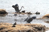 随着延吉市布尔哈通河生态环境逐年改善,吸引了很多候鸟在迁徙途中来此栖息。图为苍鹭在河面滩涂地上嬉戏捕食。延边日报全媒体记者 姜乃晗 摄