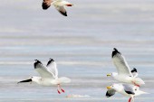3月份以来,珲春敬信湿地迎来了最佳观鸟季。在珲春敬信湿地的龙山湖面上,候鸟如精灵般浮在水面,时而觅食,时而休憩。图为成群结队的候鸟抵达“五星驿站”珲春敬信湿地龙