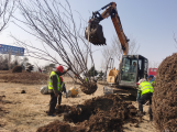 3月29日,记者在延吉市局子街与302国道交汇处三角地看到,铲车挖出合适的坑位,吊起待栽树苗,在工人配合下,准确摆进坑位,并将土方回填,一棵五角枫树稳稳矗立在绿