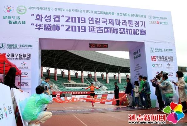 全程马拉松女子组第一名撞线瞬间