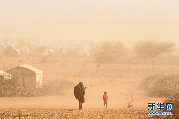 2011年8月22日,在埃塞俄比亚边境小镇多洛阿多的科贝难民营,一对索马里难民母子迎着沙尘走向营地。 新华社记者金立旺摄
