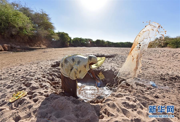 2017年3月20日,在索马里边境小镇多洛附近,一名妇女在干涸河床的水坑清理浑水,以便取用较为清澈的水。 新华社记者孙瑞博摄