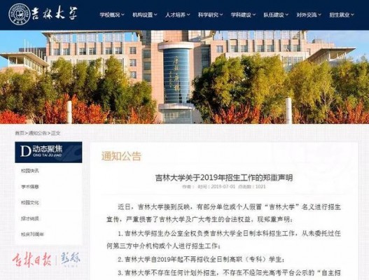 7月1日,吉林大学官网发出郑重声明:“近日,有部分单位或个人假冒吉林大学名义进行招生宣传,考生和家长们一定要注意,千万不要上当!”