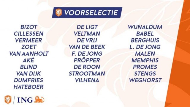 荷兰国家队公布了最新一期的28人大名单,利物浦中卫范迪克以及中场球星维纳尔杜姆领衔,巴塞罗那小将弗朗基-德容、尤文图斯后卫德里赫特在列,而状态火爆的里昂前锋德佩也再次入选大名单。