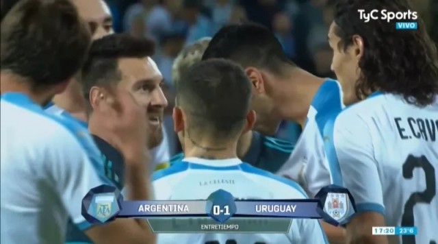 在第42分钟时,梅西被贝西诺绊倒在地。卡瓦尼走了过来,又对着梅西一顿喷。从面部表情来看,梅西明显不开心,他也用语言回击了卡瓦尼。据阿根廷TyC电视台报道称,卡瓦尼当时向梅西约架,梅西回答“时间你挑!”低调多年的梅西,在面对挑衅时却也毫无惧色。
