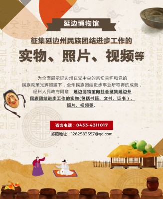 为全面展示延边州在党中央的亲切关怀和党的民族政策光辉照耀下,全州民族团结进步事业所取得的成就,经州人民政府同意,11月18日开始,延边博物馆向社会征集延边州民族团结进步工作的实物(包括书籍、文书、证书)、照片、视频等。咨询电话:0433-4311017。邮箱地址:1262583557@qq.com 。