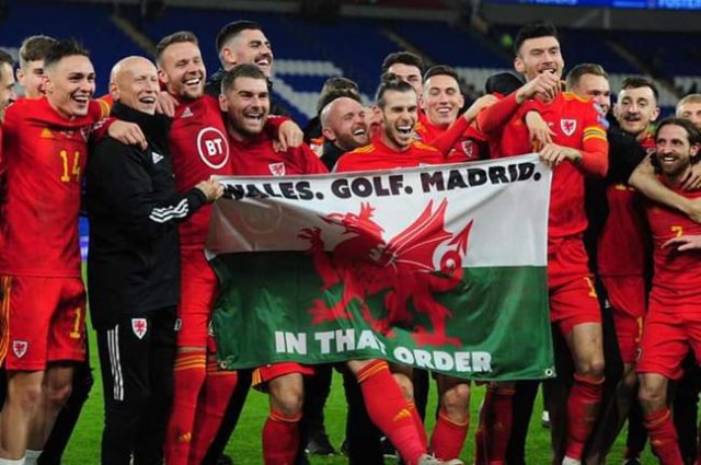 有趣的是,此番庆祝的时候,威尔士球员们拿着的正是写有这句话的旗帜,而贝尔也在庆祝的行列之中。