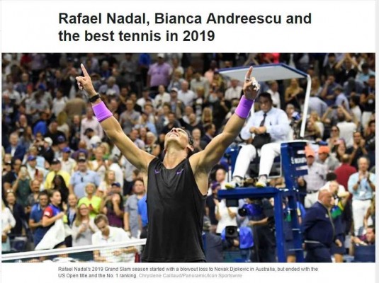 2019年纳达尔获得年终第一,赛季战绩57胜7负,斩获法网和美网冠军在内的四个冠军头衔。在网球评论家peter bodo看来,年度最佳标准应该是战绩第一或者对网球运动重大影响之人,而本赛季纳达尔的表现两者都可兼具。