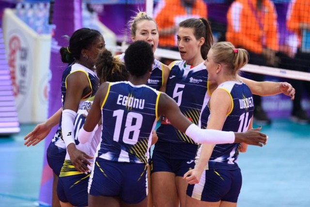 首局3-6落后的伊萨奇巴希追至6-7,金软景后攻出界,科内利亚诺8-6领先进入第一次技术暂停。中局落后7分的伊萨奇巴希在博斯科维奇的发球轮扭转被动局面,她发扣强势、金软景抓反击,一举以21-18反超。科内利亚诺追至22-23后,被博斯科维奇两度强攻打中,22-25先折一阵。