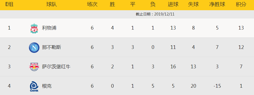 北京时间12月11日凌晨01时55分,2019-2020赛季欧冠小组赛第六轮展开角逐,卫冕冠军利物浦2-0击败奥地利挑战萨尔茨堡红牛,6战4胜1平1负积13分,以小组第一身份晋级16强。马内第57分钟助攻凯塔头槌破门,利物浦打破僵局;1分钟后,萨拉赫0角度破门扩大领先优势。萨尔茨堡红牛6战2胜1平3负,积7分,以小组第三名进入欧联杯32强。