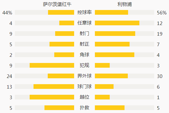 两支球队欧战史上交锋一次,即本赛季欧冠第一回合,当时利物浦主场4-3击败萨尔茨堡红牛,这场比赛场面一波三折,红军3-0领先的情况下被3-3追平,最后由萨拉赫梅开二度打进绝杀球制胜。欧战史上,萨尔茨堡红牛5次迎战英超球队,仅取得1平4负;利物浦曾在主场输给奥地利球队,2004-2005赛季欧冠资格赛0-1不敌格拉茨风暴,但3次做客奥地利取得了2胜1平保持不败。上周末,两支球队均进行了一场联赛,萨尔茨堡红牛主场5-1横扫瓦腾斯,最近9场正赛取得6胜3平不败成绩;利物浦客场3-0大胜伯恩茅斯,最近17场正赛14胜3平保持不败。