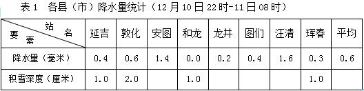 记者在延边州气象局了解到,12月10日22时至11日08时,我州普降小雪,全州平均降水量为0.6毫米,最大降水量出现在汪清县,为1.6毫米(见表1)。