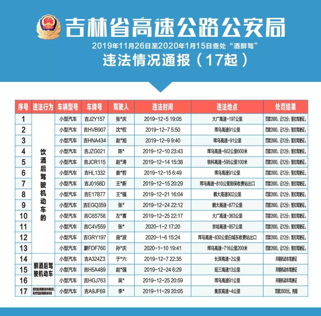 以下为2019年11月26日至2020年1月15日,吉林省高速公路公安局共查处“酒醉驾”违法行为17起。