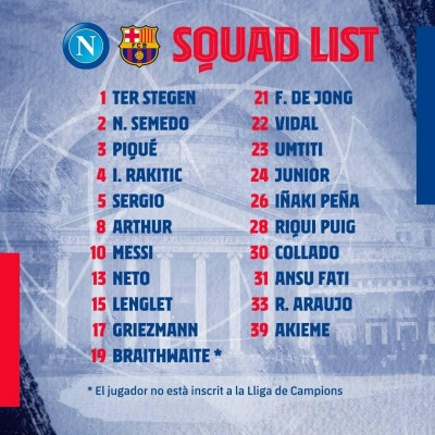 附巴萨出战那不勒斯大名单:
