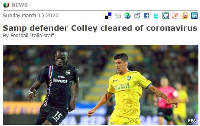 意甲桑普多利亚俱乐部是受新冠影响最严重的球会,此前阵中共有7名球员确诊(加比亚迪尼、科莱、埃克达尔、拉古米纳、托斯比、德保利、贝雷辛内斯基)。而今,后卫科莱带来了好消息,在经过更多的测试后,自己和家人的新冠检测已呈阴性。
