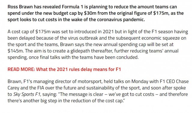根据罗斯-布朗透露,有关于2021年,车队财政预算上限的工资帽讨论工作,经多方磋商斡旋,已经进入到了最后的阶段。而各支车队的预算上限,也将从1.75亿美元下调至1.45亿美元。