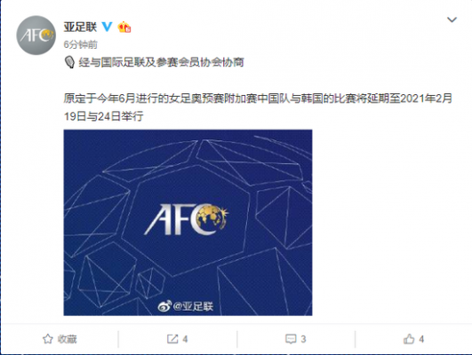 北京时间5月27日,亚足联官方微博宣布,原定于今年6月进行的女足奥运附加赛中国队与韩国队的比赛,将延期至2021年2月19与24日举行。