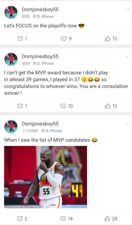 4月15日,在无缘CBA最佳外援评选之后,网络上盛传多米尼克-琼斯就MVP评选的多次吐槽,“当我看到MVP候选人名单。”琼斯写道,并发布了一张自己偷笑的照片。随后他又写道:“我不能得到MVP就因为我没打够39场比赛只打了37场比赛?那么不管谁当选了都恭喜他,你这个安慰奖得主!”“让我们专注于季后赛吧!”琼斯最后写道。