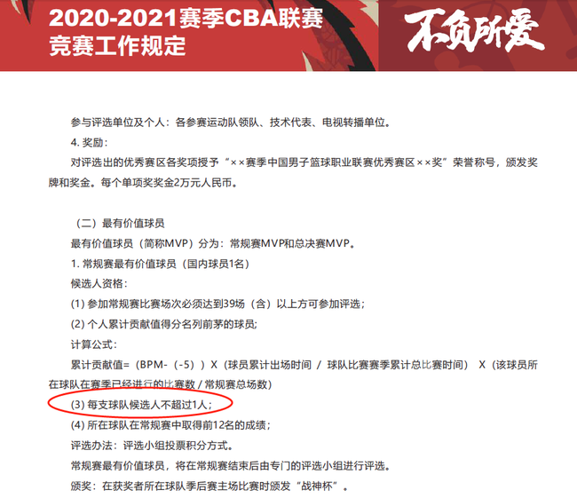这个规定是这个赛季前就制定了的,由于郭艾伦的“个人累计贡献值”在队内分值比赵继伟低,所以,郭艾伦失去了参加MVP的评选资格。可以说,从数据角度说, 郭艾伦输给了队友赵继伟。