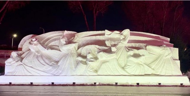 采访中记者了解到,除第九届延吉国际冰雪旅游节主会场——延吉市人民体育场前的门楼冰灯外,李福军团队还为延吉市内的7处重要游园广场建造了节日冰雕、雪雕艺术景观,为城市节日氛围增添亮点。在金达莱广场,一座名为《金达莱的故乡》的巨型深浮雕作品吸引市民驻足拍照。雪雕中央,两位朝鲜族姑娘手拿折扇、腰悬长鼓,舞姿轻盈;两侧雕刻的金达莱花、动车、和平鸽、小鹿等元素,尽显延吉喜迎八方来客、笑纳四海宾朋的热情氛围。