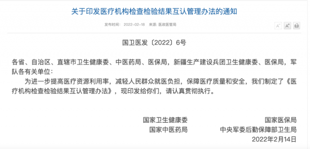 国家卫生健康委、国家医保局、国家中医药局、中央军委后勤保障部卫生局近日印发通知,为进一步提高医疗资源利用率,减轻人民群众就医负担,保障医疗质量和安全,制定了《医疗机构检查检验结果互认管理办法》,该办法自2022年3月1日起施行。