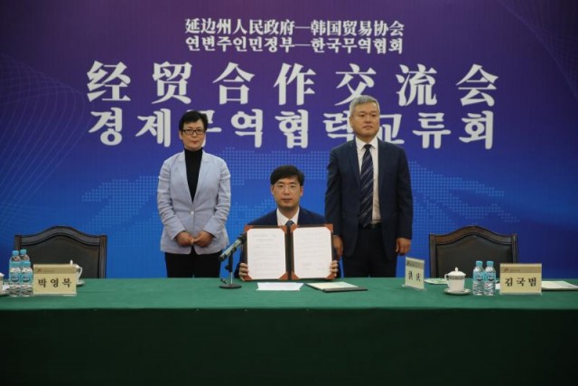 交流会上,延边州人民政府与韩国贸易协会以视频形式签订了经贸合作意向书。