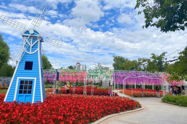 8月24日,记者在改造一新的延吉市人民公园看到,蓝柱墙白扇叶的风车矗立在红色的花海中,异域风情十足;白色、粉色、紫色的花藤长廊,浪漫气息浓郁;白色凉亭下,蓝色乒乓球案一字排开,运动氛围立现……这里不仅完成了美丽升级,而且实现了运动“晋级”。