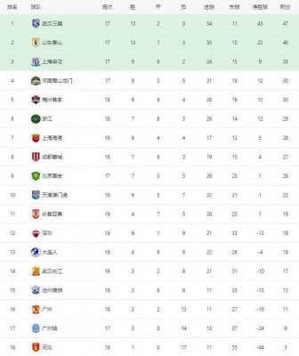 在积分榜方面,武汉三镇15胜2平,积47分,暂列积分榜榜首;山东泰山13胜1平3负,积40分,暂列第二;上海申花9胜6平3负,积33分,暂列第三;河南嵩山龙门9胜3平5负,积30分,排名第四。