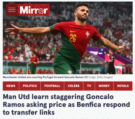 当前,拉莫斯与本菲卡的合同至2026年夏天,除非本菲卡收到有吸引力的报价,否则他们不会出售这位前锋。据多家媒体的消息,目前拉莫斯的买断条款约合1.2亿欧元。对于曼联来说,这个价格可能太高了,因为今夏红魔的引援费用超过了2亿镑。
