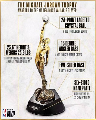 其中,最引人瞩目的MVP命名为迈克尔-乔丹奖,以此表彰“飞人”的贡献。NBA官方表示,乔丹奖的奖杯高23.6英寸,重23.6磅,代表乔丹的球衣号码(23)和NBA总冠军数(6)。它的五面垒是对乔丹5次常规赛MVP的致敬;六面同名徽章,则是向乔丹6次总冠军致敬。还有就是,底座的15度角是对乔丹15个赛季职业生涯的致敬,水晶篮球由23面组成,这是对乔丹球衣号码的致敬。最后是,水晶篮球的直径为1.23英寸,这与MVP和乔丹杰出职业生涯的独特关联有关。