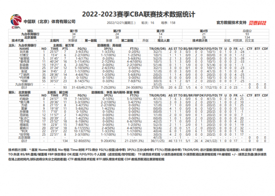 网易体育12月21日报道:12月21日晚,常规赛第16轮吉林对阵北京。阵容相对齐整的北京队早早拉开分差,最终北京队134-93轻松击败吉林队,北京全队12人均有得分进账。四节比分为:34-37、24-38、14-31、21-28(吉林队在前)。