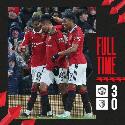 北京时间1月4日凌晨04点,2022/2023赛季英超联赛第19轮继续进行,曼联坐镇主场迎战排名第15位的伯恩茅斯。上半场比赛中卡塞米罗任意球中抢点垫射破门,下半场卢克肖和拉什福德先后进球,最终曼联主场3-0战胜伯恩茅斯,豪取近期各项赛事6场连胜,英超联赛的4连胜,少赛一场下积分追平纽卡斯尔暂居联赛第四。