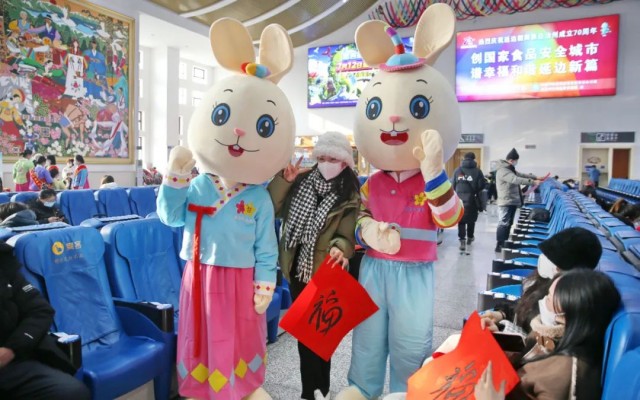 “妈妈,快看,好可爱的兔子!”当日的延吉西站候车室,人流熙攘,八岁的旅客唐同学第一眼就被以生肖兔子作为设计原形、身着鲜艳朝鲜族民族服装的兔年吉祥物“征征”和“程程”吸引。据延吉车务段副段长李道勇介绍,“征征”和“程程”是他们为2023年春运量身定制的民俗吉祥物,也是自2015年长珲城际线开通后,连续推出的第八对春运吉祥物。“征征”和“程程”一经亮相,其憨态可掬的样子立即萌翻全场,吸引众多旅客前来拍照留念。