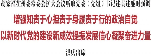 1月10日,省委常委、州委书记胡家福主持召开州委常委会扩大会议,听取各县(市)党委书记、部分州直部门(单位)党组(党委)书记述责述廉。他强调,要深入贯彻习近平总书记关于全面从严治党的重要论述,认真落实党的二十大和二十届中央纪委二次全会精神,增强知责于心、担责于身、履责于行的政治自觉,以新时代党的建设新成效提振发展信心、凝聚奋进力量。州委副书记、州长洪庆出席会议。