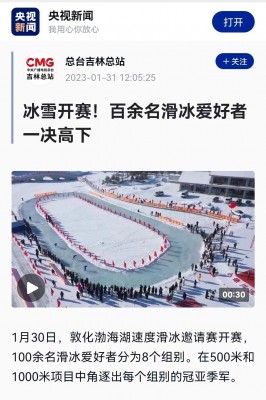 近日,央视新闻、吉林新闻联播、吉林日报、延边新闻等主流媒体纷纷报道2023中国·敦化渤海湖速度滑冰邀请赛。