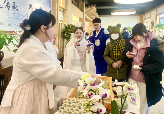当天,中国朝鲜族民俗园里举行了独具朝鲜族特色的传统庆祝活动。游客们身着朝鲜族民俗服饰,手里举着木槌,体验现场制作朝鲜族传统美食打糕。他们还品尝了代表着美好寓意的“聪耳酒”和五谷饭,园内洋溢着浓厚的节日氛围。