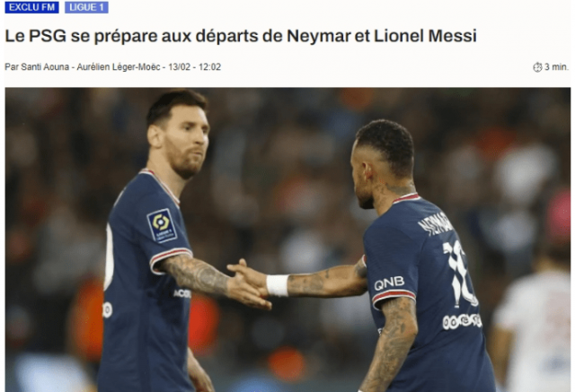 北京时间2月14日,法国媒体Foot Mercato独家报道,巴黎圣日耳曼正在为今夏梅西和内马尔可能的离队做准备。