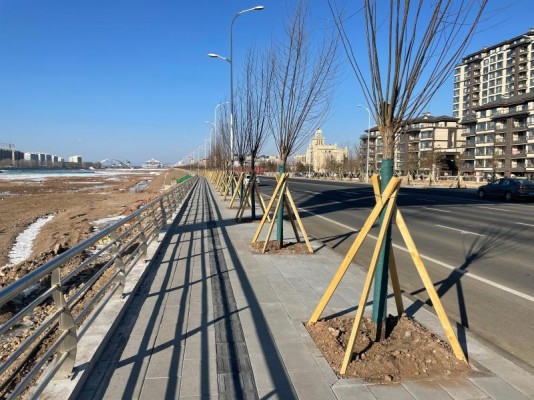 2月14日,记者在延吉市布尔哈通河北侧延河路延伸工程现场看到,沿路两侧每间隔约4米左右就栽种了一棵柳树。据延吉市住房和城乡建设局城建科副科长张灿旭介绍,该项目的道路工程自去年8月底完工通车后,于11月中旬进入绿化工程阶段,经过一个多月的绿化施工,以布置树池的方式种植了854株柳树,同时完成了树苗扶正保护和防寒工作。