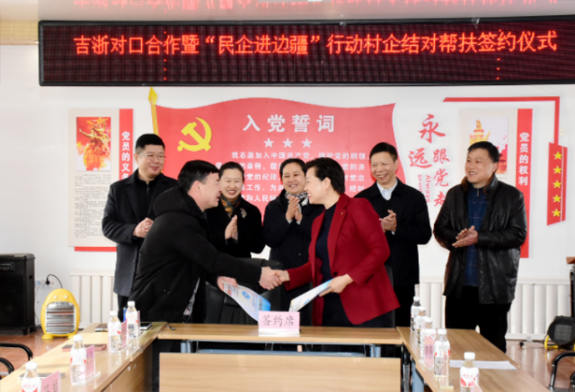 考察组一行先后前往位于珲春市的东北亚跨境电商产业园、互贸落地加工产业园、雅戈尔服装有限公司。每到一处,考察组成员认真参观考察,详细了解企业的生产和运营情况,学习交流经验与做法,探讨未来合作方向。在图们市石岘镇下龙城村,考察组听取了该村基本情况、产业现状的汇报,并围绕当地特色产业的发展进行讨论交流。浙江康喜乐嘉投资股份有限公司同下龙城村当场签订了村企结对帮扶协议。