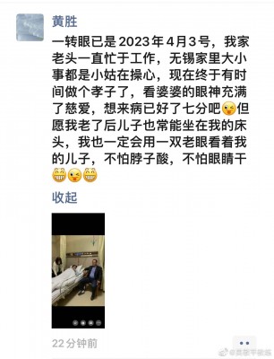 国乒金牌教练吴敬平晒出朋友圈截图,截图内容为蔡振华妻子黄胜所发,她发布蔡振华陪伴母亲的照片。黄胜写道:一转眼已是2023年4月3号,我家老头一直忙于工作,无锡家里大小事都是小姑在操心,现在终于有时间做个孝子了,看婆婆的眼神充满了慈爱,想来病已好了七分吧但愿我老了后儿子也常能坐在我的床头,我也一定会用一双老眼看着我的儿子,不怕脖子酸,不怕眼睛干。