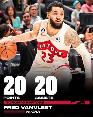 5. 范弗利特是猛龙队史上第3位完成20+20的球员,而且是首位完成20分20助攻的球员。此前,琼斯曾贡献22分21篮板,波什曾拿到24分22篮板和23分22篮板。