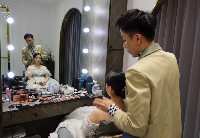 “您想哪天拍婚纱照?抱歉,我们周末的档期已经订满。”3月30日,在延吉星工场摄影王国,前台的电话应接不暇,接待人员一手拿着电话,一手飞快地翻着婚纱拍摄登记簿。据延吉星工场摄影王国化妆师东青介绍, 今年的客流量与前三年相比不只翻了一两倍,除了婚礼旺季的婚纱摄影,还有一些受延吉网红城市影响的外地游客,他们都是奔着体验民俗风情而来,拍一套有朝鲜族特色的婚纱照或是写真。东青告诉记者,工作人员每天都在满负荷地工作,虽然忙碌,但是看到行业回暖,婚庆经济持续升温,他们非常开心。