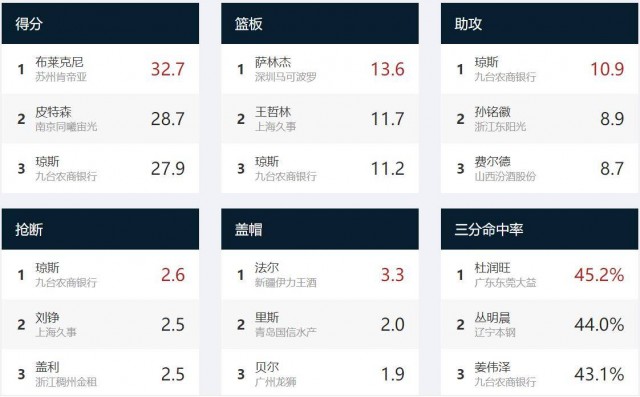 根据CBA官网的数据显示,在得分、篮板、助攻、抢断以及盖帽这5项主要数据中领先的均为外援,吉林队的琼斯更是4项数据排名前三位,常规赛场均贡献三双的数据。而三分球命中率排在前三位的均为本土球员,广东队的杜润旺以45.2%的超高命中率位居首位。
