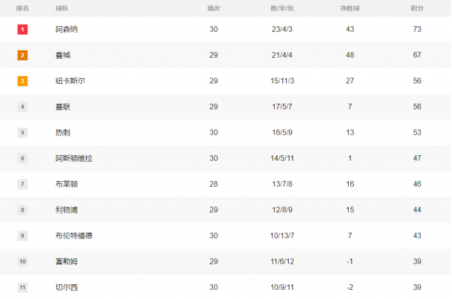 您的当前位置:智慧体育首页 > 看资讯 > 新闻资讯 > 英超积分榜:阿森纳多赛1轮6分领跑 纽卡曼联争四无忧