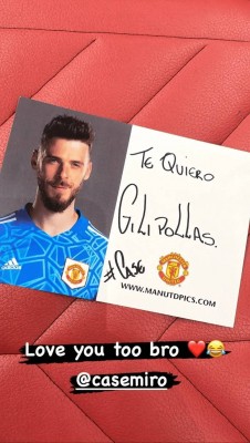 德赫亚在社媒晒出了卡塞米罗留给自己的纸条,上面写着:“我爱你,混蛋。”与此同时,德赫亚也在这条动态中写道:“我也爱你,兄弟。”