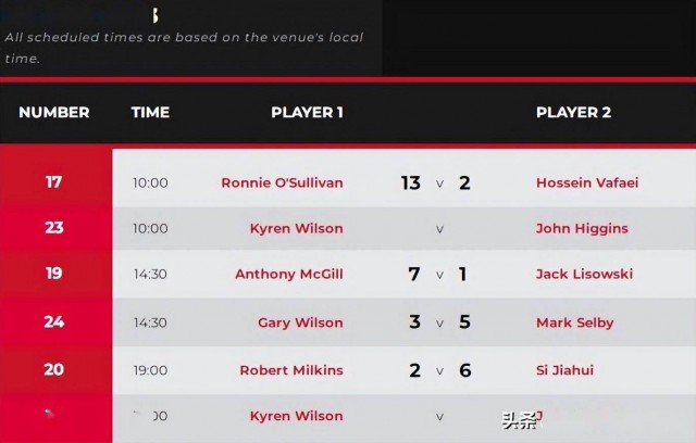 接下来的第9比赛日,凯伦·威尔逊和希金斯的比赛要打完前两个阶段,另外,斯佳辉和罗伯特·米尔金斯进行第二阶段比赛、塞尔比和加里·威尔逊进行第二阶段比赛、利索夫斯基和安东尼·麦克吉尔进行第二阶段比赛。理论上来说,在奥沙利文提前晋级后,第9比赛日不会产生八强席位,但考虑到安东尼·麦克吉尔7-1领先利索夫斯基,斯佳辉也取得了不错的领先优势,他们有机会在第二阶段提前终结比赛悬念!