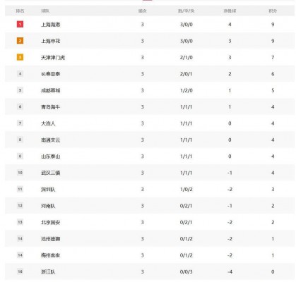 在积分榜方面,上海海港3胜0负,积9分,暂列第一;上海申花3胜0负,积9分,暂列第二,天津津门虎2胜1平积7分,暂列第三;山东泰山1胜1平1负,积4分,暂列第9;武汉三镇1胜1平1负,积4分,暂列第十。