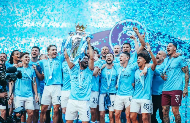 在5月份之前,本赛季英超冠军的争夺还是相当激烈,阿森纳一度以8分的优势在积分榜领跑,当时不少球迷都认为,枪手将会时隔19年,再度摘得英超的桂冠。但是在和曼城直接对话中的完败以及接连在保级队身上丢分,让阿森纳渐渐掉队,在本轮客场输给诺丁汉森林队之后,阿森纳的积分已经不可能再追上曼城,蓝月军团就这样幸运地提前收获了联赛冠军,完成了英超又一个三连冠的壮举!