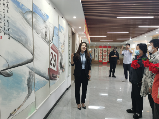 文庆社区红色故事宣讲员杨炳凤对抗美援朝这段历史了然于胸,声情并茂地向参观群众讲述起每一幅画作背后的真实故事,在场群众深受感动和震撼。