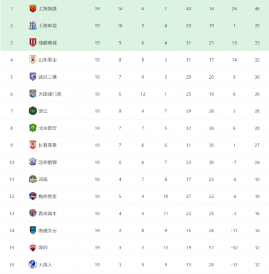 在积分榜方面,海港14胜4平1负,积46分,排名第一;申花10胜5平4负,积35分,排名第二;成都9胜4平6负,积33分,排名第三。泰山8胜8平3负,积32分,排名第四;三镇7胜9平3负,积30分,排名第五;国安7胜7平5负,积28分,排名第八位。